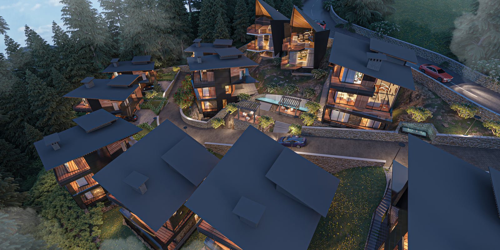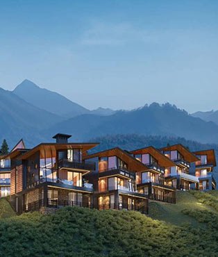 Of contemporary cottages, surrounded by the natural grandeur of hills.
